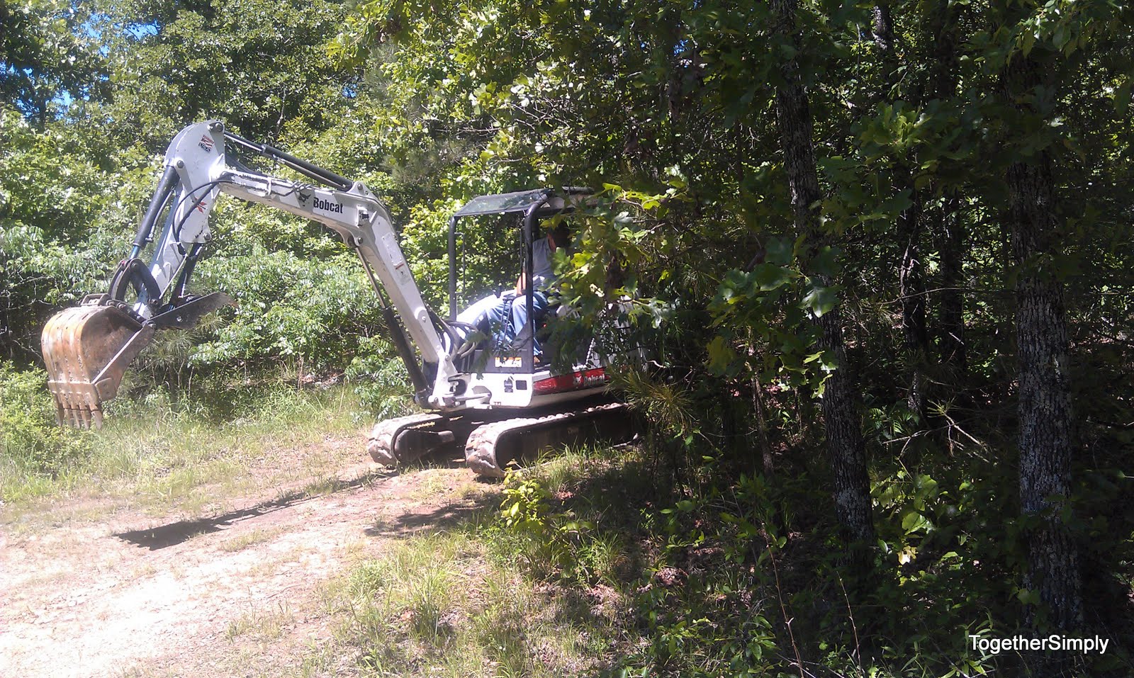 On to technical stuffs – the bobcat was delivered yesterday. Mr. Man cleared most of the driveway. This afternoon it was all put on hold – the pin that holds the bucket to the arm was slipping out. They should be out in the morning to fix it or bring a new one. The chainsaw also won’t stay running. Tomorrow may end up being a fixing day but we are hoping for a lot of progress. Hoping we can set up camp this weekend.