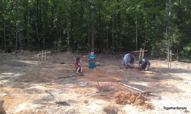 On to nitty gritty – Mr. Man and Bou got most of the holes for the pier done with an auger we rented today. I say most because it got wicked stuck on the second to last hole. Stuck as in after 2 hours of them fighting with it, I finally called in reinforcement – DT to the rescue! Many praises sung when in 10 minutes it was out and they had the last hole done! Apparently it just needed that extra man strength that our teen boy is still developing. He has been doing so great though! Hard work for sure, but such a huge help! Mini showed up later to help move the poles up from the bottom of the hill where we had to leave them yesterday because of the rain. Whew! Will make tomorrow’s pole setting much easier!
