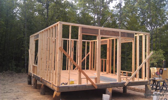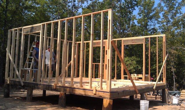 Neat trick we learned – figure 1 stud per foot of wall – so for a 16 foot wall, figure 16 studs. Worked pretty good. We purchased 40 studs the first go around and had 12 left over. Purchased 52 more (16+16+20) and the only leftover studs are the 4 bracing the first floor. Of course we did have to use studs for the framing of windows and doors and for blocks. Had we purchased 8′ boards or something similar we would have had studs left over.