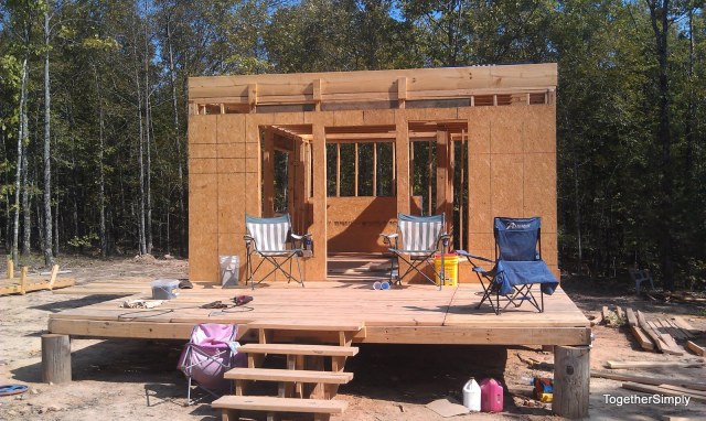 Enough about the weather. Not much progress to report, except for Deck: Phase 1 – Complete. Just added 160 sqft of usable-most-of-the-year space! And for free (minus hardware of course)!! Tada!! Mr. Man said it looks like a big pallet… which it does 😛 But we will paint/stain it and it will look totally different… I hope… Railing and a roof and it will be done – yay! We also picked up a ton of electrical stuff, a brand new toilet and a window AC unit from Blue (he has been the collection person for donations). Little by little we are getting things acquired. This weekend my mom is purchasing the roof and most of the OSB. Depending on the weather and how fast we can get it done, we might be closed in next week. Trying not to get my expectations to high though, it has been a rough couple of months with this adventure. But it is happening – sure and steady!