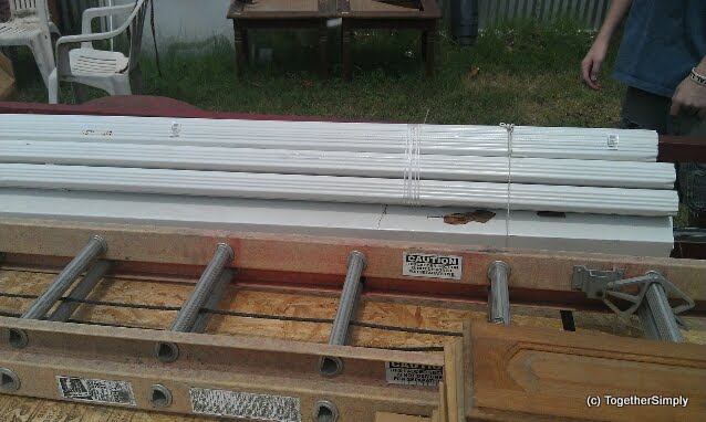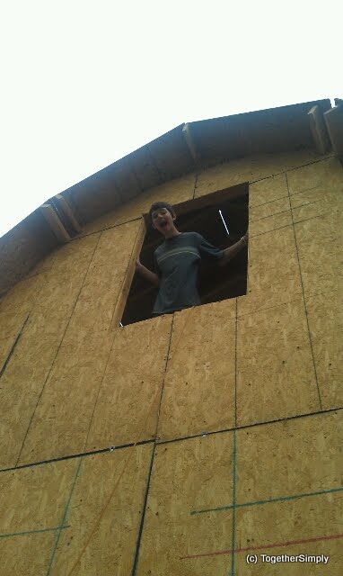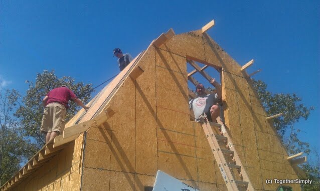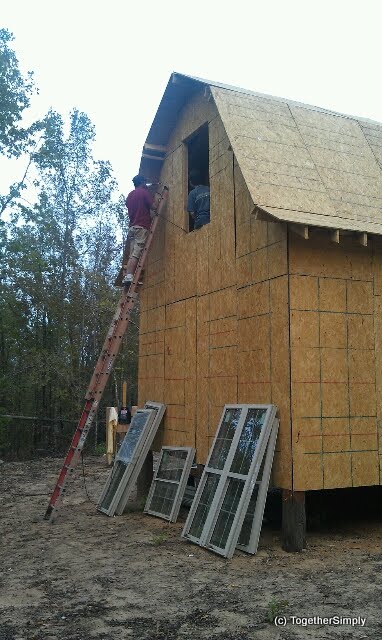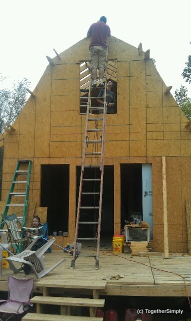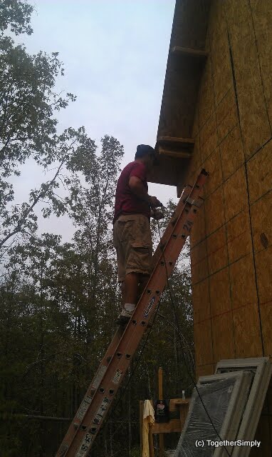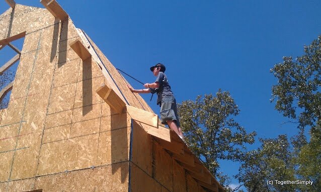 This is another one of those slow but busy weekends! Not for lack of work – Mr. Man spent hours on the roof and ladder screwing all the sheathing down properly. Not a whole lot was added to the house (actually only 1 piece) but everything is screwed down and most of it is cut out. The children and I spent the weekend cleaning up as best we could. We only managed to gather 3 wheel barrels full of scrap wood, which I think is pretty good – not a lot of waste!
