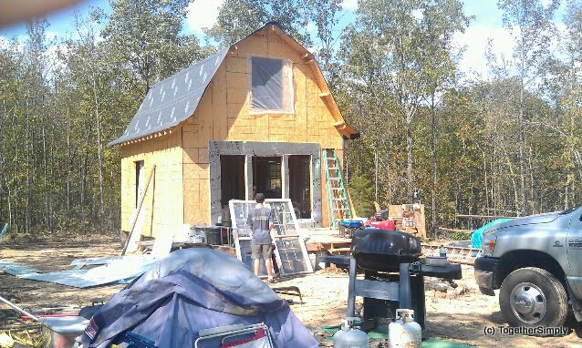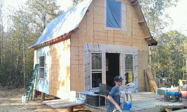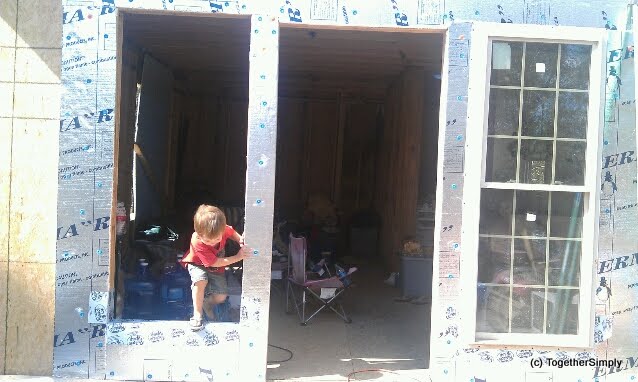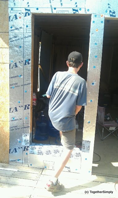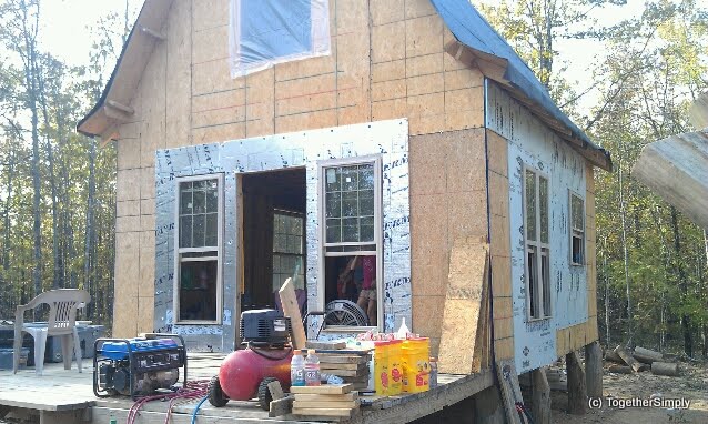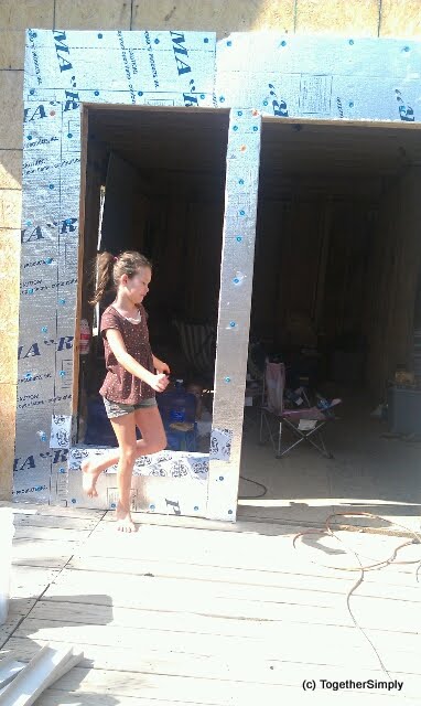 Yes, another unconventional move on our part.  See we were given some of the needed foam board.  But a lot of the blue stuff was banged up.  So we cut off the good parts and pieced it around the windows.  The thinking being we plan on adding on the sides and it will all be stripped down anyway.  This will get us to that point.  The front we are using the thicker, reflective foam boards since it faces almost due south.