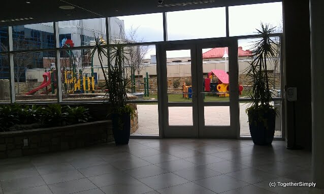 The “view” is to a roof top atrium with an outdoor playground! How neat is that?!