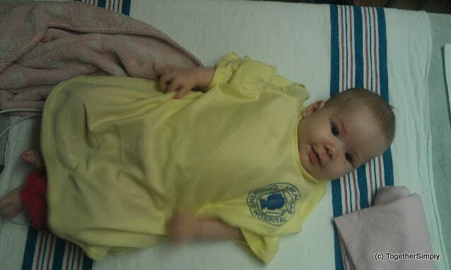 | Look ma! No tubes or wires! Oh and yea, that is a glorious hospital butt-showing gown! In baby size! Too Cute! |