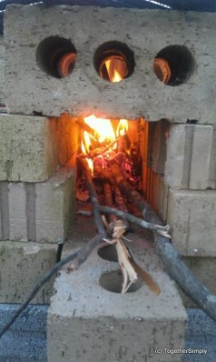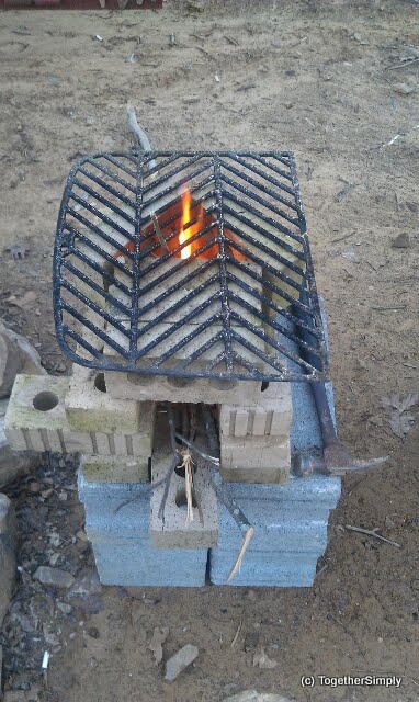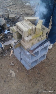 Not wanting to end the day on a horrible note, I went to the next project I knew would be easy peasy – the rocket stove!Its a total temp solution. The permanent one will go in the backyard, but we need something to cook on now. We used 21 bricks and just Lego-style’d them.