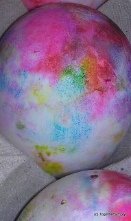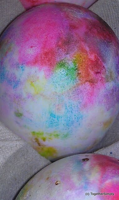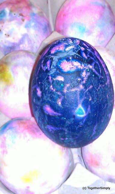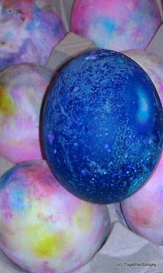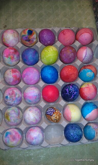 Dying eggs was interesting as well… We baked 2 1/2 dozen in the toaster oven. Yes, baked. Laid out on the rack, 350 for 30 minutes, plunge in ice water. Made doing a bunch of eggs SSSOOOO easy!