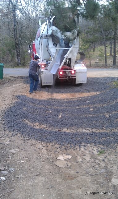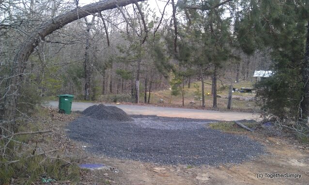 Mr. was able to deliver a load of gravel! Slowly but surly, one truck at a time, we will get this 600 foot driveway graveled. It was really nice to be able to use the truck to mostly spread it out! For the first load we had an excavator to make it less labor intensive. Boy was I dreading doing it all by hand. We still had a bit to do by hand, and hauling it to the various pot holes (are they still pot holes even though it’s in dirt and not paved?)