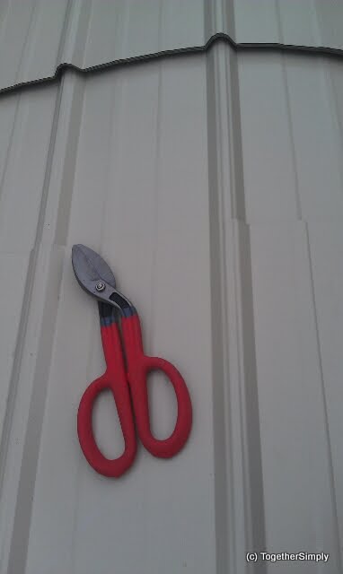 Cutting metal roofing is so not as easy as “oh, just cut it with some tin snips”. Or maybe it is for guys that have mucho experience. Cause I’m here to tell you it’s harder than that. The chalk like doesn’t snap cleanly, the ridges are really awkward and tin snips are made for (bigger) guy hands. I can’t get them open enough to cut more than a tiny bit and after one sheet my hands were so sore. There has to be a trick to it. Thankfully, after I got half of them cut Mr. woke up and finished them off. Lord help us if we have to rip them lengthwise!
